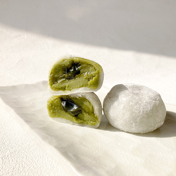 抹茶餡の中心に、さらに濃厚な蜜状の抹茶を包み込み、大福餅に仕上げました。