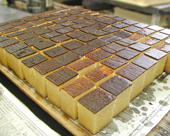 大きなカステラを焼き上げて同じ大きさに切りそろえて行きます。